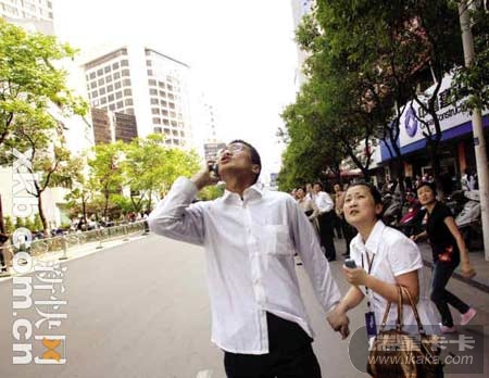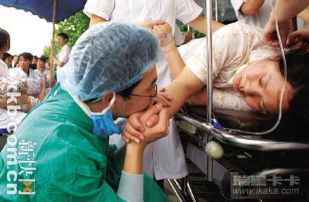 成都锦江区妇产科医院在地震后将即将生产的产妇转移到了室外,这位丈夫给妻子送上深情一吻,陪伴着妻子。