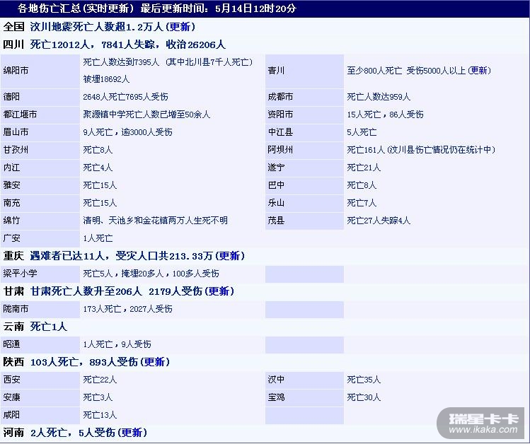 [tr=#296cbd]| 各地伤亡汇总(实时更新) 最后更新时间:5月13日11时30分 | | | |