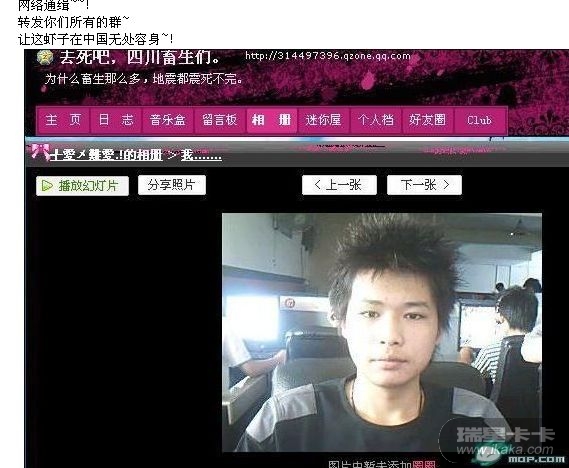 在网吧偶看一男子在打字,忽一看是打着"吊这次地震,害佬子几天没得玩游戏去S胡锦T,去死MB汶川"气愤之余,我告诉身边几个朋友,故意撞了一下那个不知天高地厚的小子!