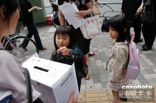 5月18日,一位日本小朋友为四川大地震灾区捐款。当日,日本侨报社创办的星期日汉语角举行第40次交流会,主题为“向四川震区人民献爱心”募捐和义卖活动。汉语角参加者来到繁华的池袋车站进行街头募捐,表达大家支援中国抗震救灾的爱心。