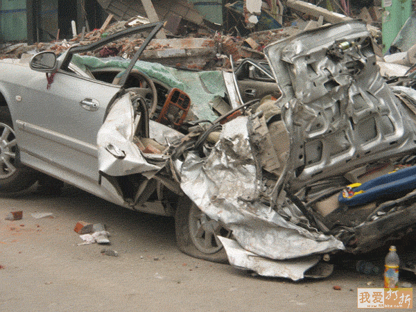 路边一辆完全变形的车,不知道地震的时候里面有没有人,希望没有.......