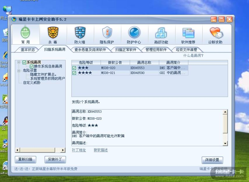 我用卡卡扫描系统漏洞时,显示有两个漏洞,我打补丁完成系统重启之后,再扫描还是显示那两个漏洞还存在。弄了几次都是这样~~~