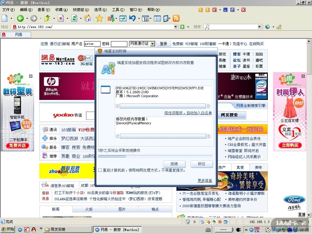 这两天一上网,主要是访问网易,我的电脑的首页,就会弹出瑞星发现有程序修改内存,然后瑞星和防火墙就被关掉了,系统不正常,用以前的ghost包恢复系统,进入网页还是一样的情况,几次都是这样!不过用杀毒软件检查没查出什么病毒!不知道是什么病毒引起的,或是网易的着页上有毒!