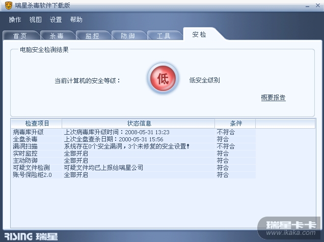 瑞星升级后在电脑安全检测里显示仍不符合!但软件提示已经升级到最新.求高手,好心人给解答下.在这谢谢了!