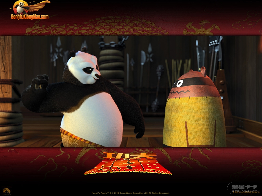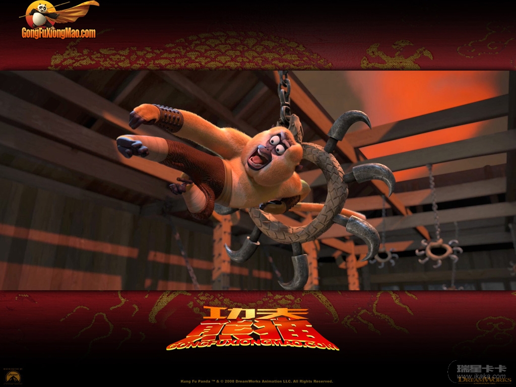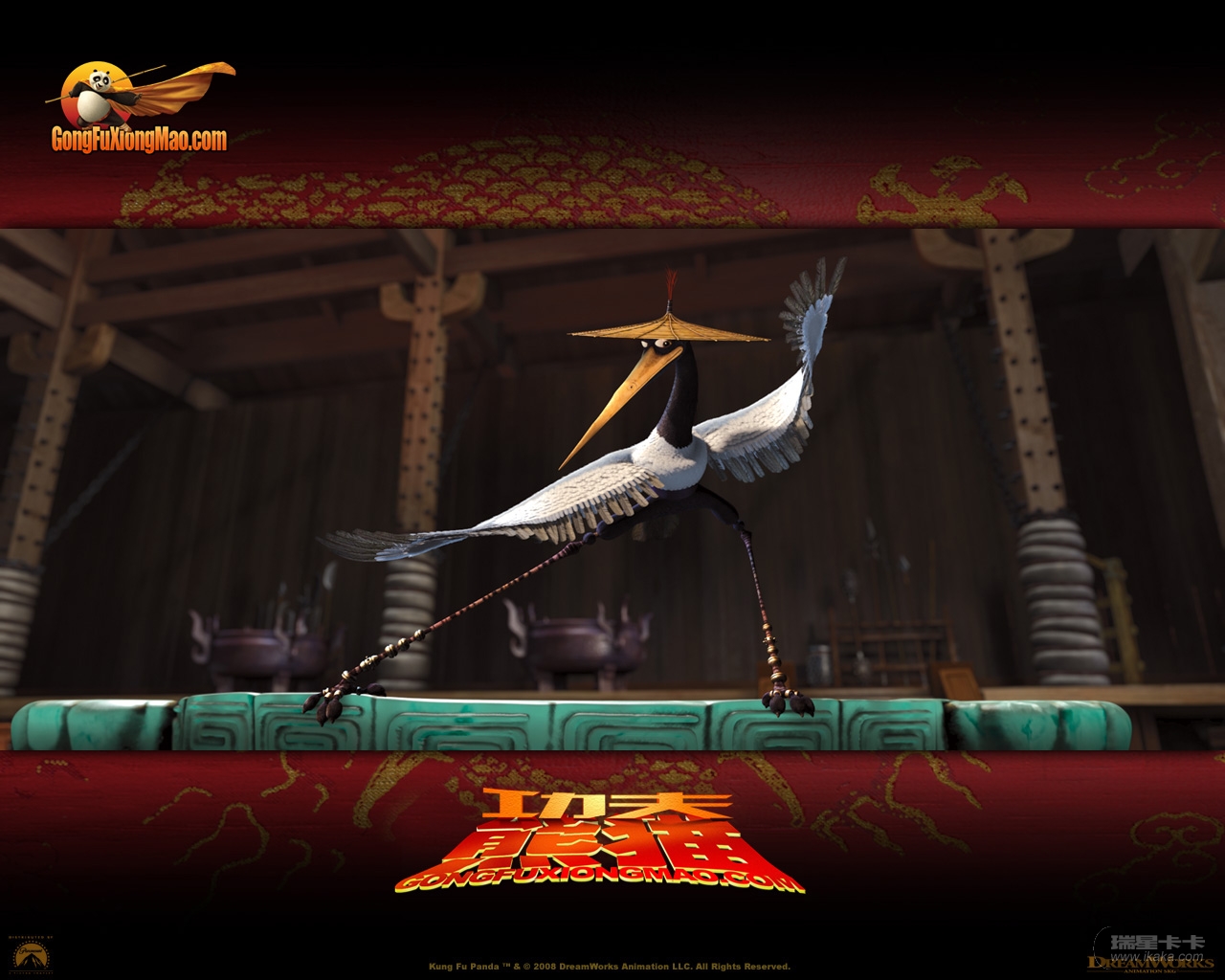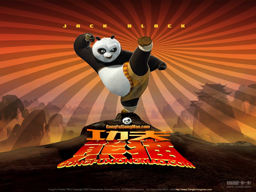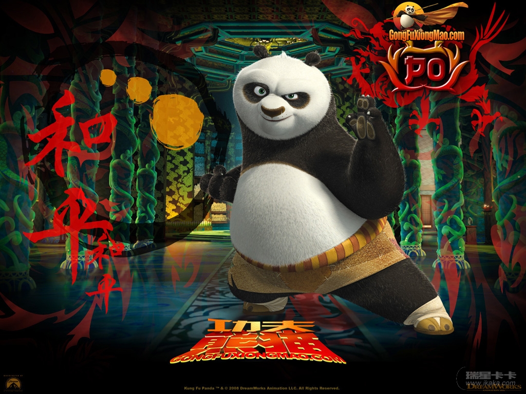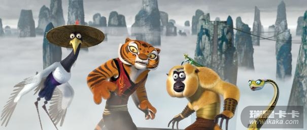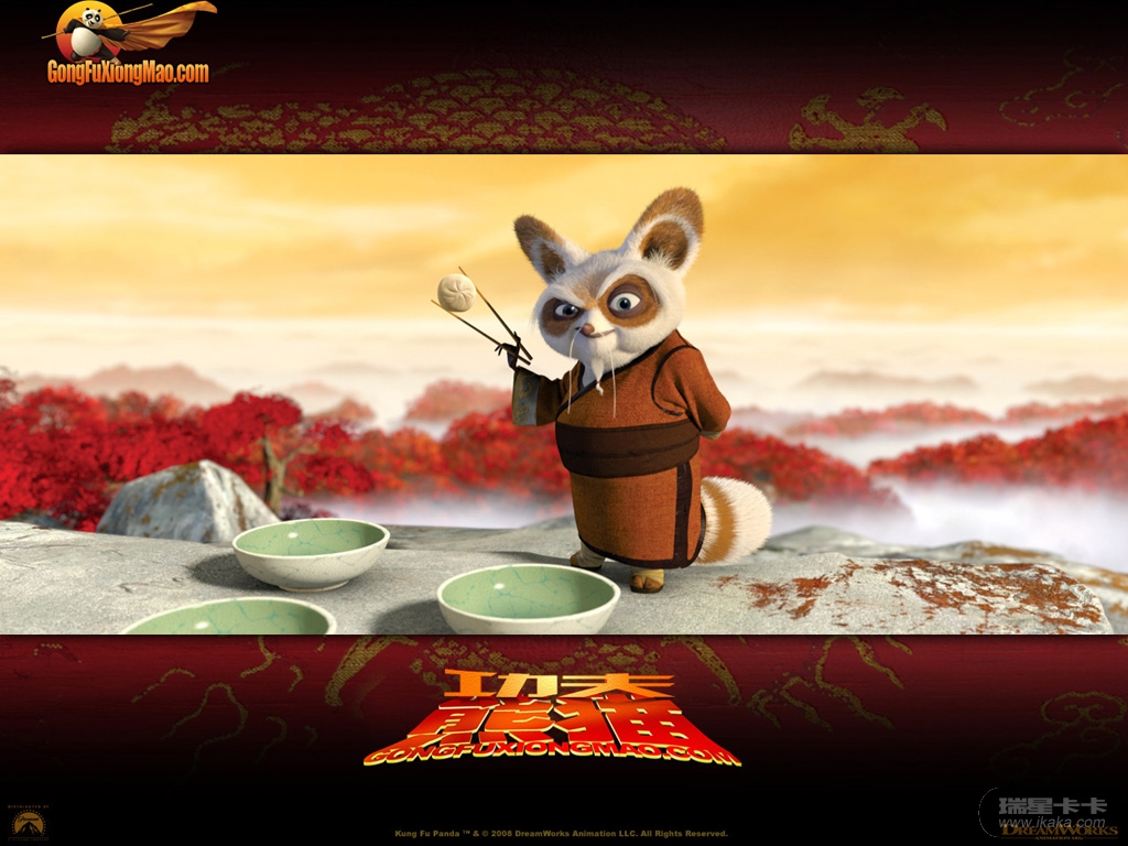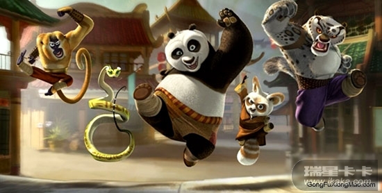 远处群山缭绕,近布轩辕古迹,龙腾虎跃、月下侠客、飞檐走壁、虎鹤双形、竹林绿影,就连筷子和青釉碗也摆上桌面....,绚烂的色彩+水墨的写意,这番好莱坞出品的“中国制造”,还真有几分以假乱真的劲头!中国功夫空袭好莱坞,既赶上“中国风”的潮流,又“巧遇”奥运强档,不愧是应景的大赚野心之作。领头的功夫大哥大,更干脆成了古老中华的武侠本尊--五禽戏的老祖宗们和憨遍天下无敌手的国宝大熊猫。