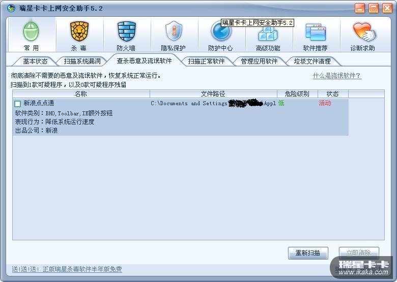 今天早上开机刚想进行同样操作,突然心血来潮想看看卡卡是不是能查出点什么东西来——结果不查不要紧,一查吓我一跳!居然真查出来一个木马!!:default1: 并且差点随手就点了“一键清除”。但想了解到底是什么木马,还是查看了详细。