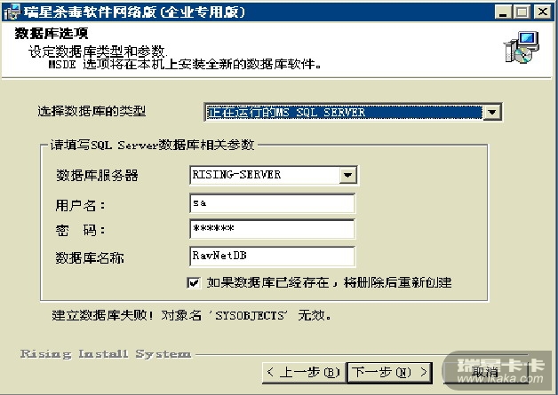 安装瑞星2008网络版———>选择数据库类型------->sqlserve------------>出现建立数据库失败!对象名'SYSOBJECTS'无效.