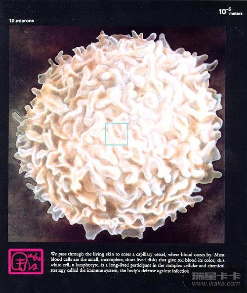 穿过表皮,我们进入了一根有血液进出的毛细血管。大多数血红细胞都是小小的、不完整的、短命的饼状结构,血液的颜色其实是它们的颜色。这个白色的细胞叫淋巴细胞,它的寿命较长,而且是免疫系统——抵御细菌感染的一种细胞及化学策略——的一份子。