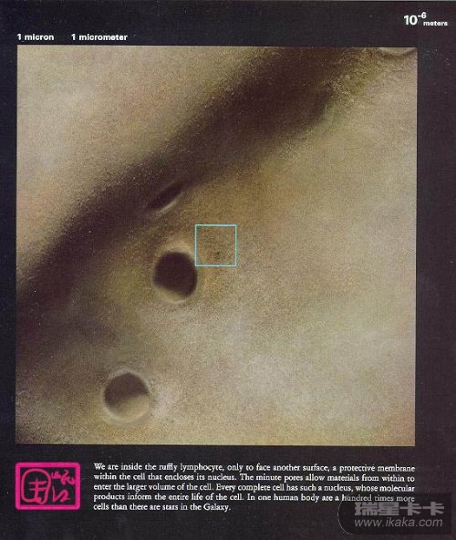 【此图所示区域的边长约为10微米,即10-5次方米。生物体内大多数细胞的大小都在10微米上下。当然也有例外。人体内部个头最大的单个细胞是女性的卵子,直径约0.1毫米,即100微米。而世界上最大的单个细胞是鸵鸟的蛋,直径是分米量级的。】