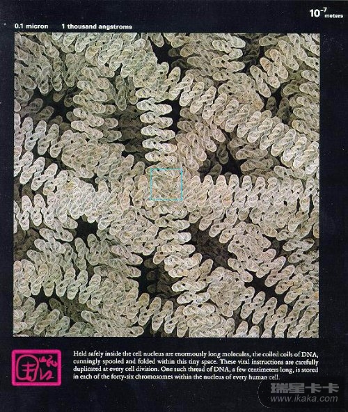 【此图所示区域的边长约为0.1微米,也可以说是1000埃(Angstrom),即10-7次方米。一条DNA分子链的直径约为20埃,而它自己绕在一起形成的一段DNA卷,直径约100埃。】