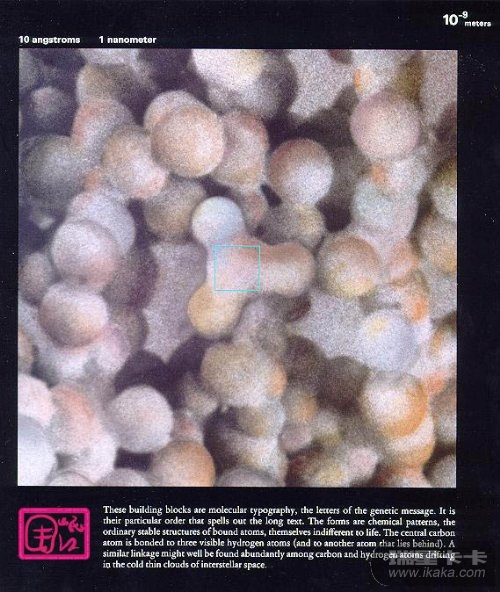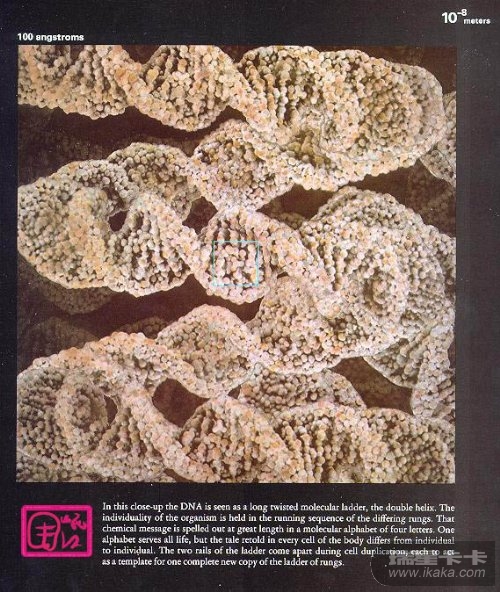 【此图所示区域的边长约为100埃,即10-8次方米。DNA内的生命信息是用4种核苷酸来记录的:腺嘌呤(deoxyAdenosine monophosphate,A)、胸腺嘧啶(deoxyThymidine monophosphate,T)、鸟嘌呤(deoxyGuanosine monophosphate,G)和胞嘧啶(deoxyCytidine monophosphate,C)。核苷酸的配对规则是A-T,G-C。在指导细胞的活动时,DNA先将需要表达的信息转给一种“信使RNA”,而“信使RNA”上每3个核苷酸代表一种蛋白质。蛋白质共有20种,而4种核苷酸,3个一起就有43,共64种可能性,足以代表所有种类的蛋白质。】