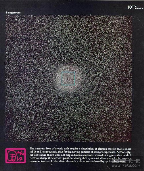 【此图所示区域的边长约为1埃,即10-10次方米。很明显这不是真实的照片,因为电子云是拍不到的。】