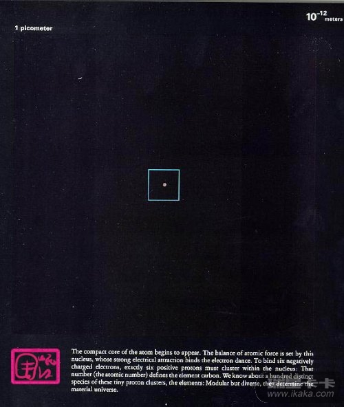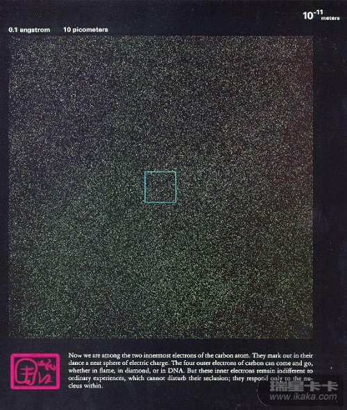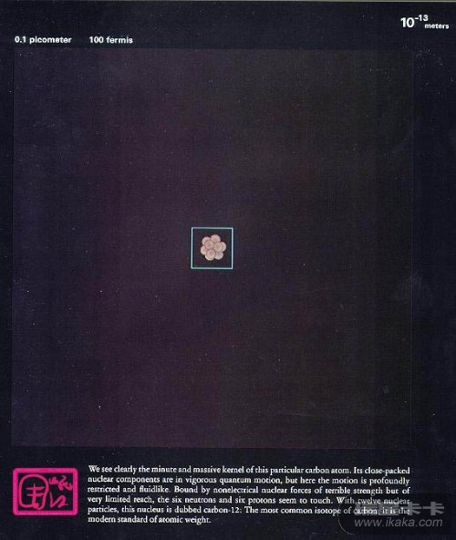 【此图所示区域的边长约为1皮米,即10-12次方米。从这里往下是原子物理、核物理的主要研究领域。碳的同位素共3种:碳12、碳13、碳14。其中碳14会稳定地衰变成氮14,半衰期约5700年,可以用来测定文物的年代。】