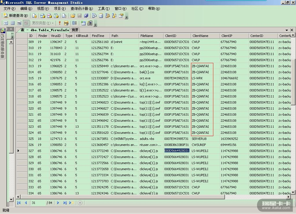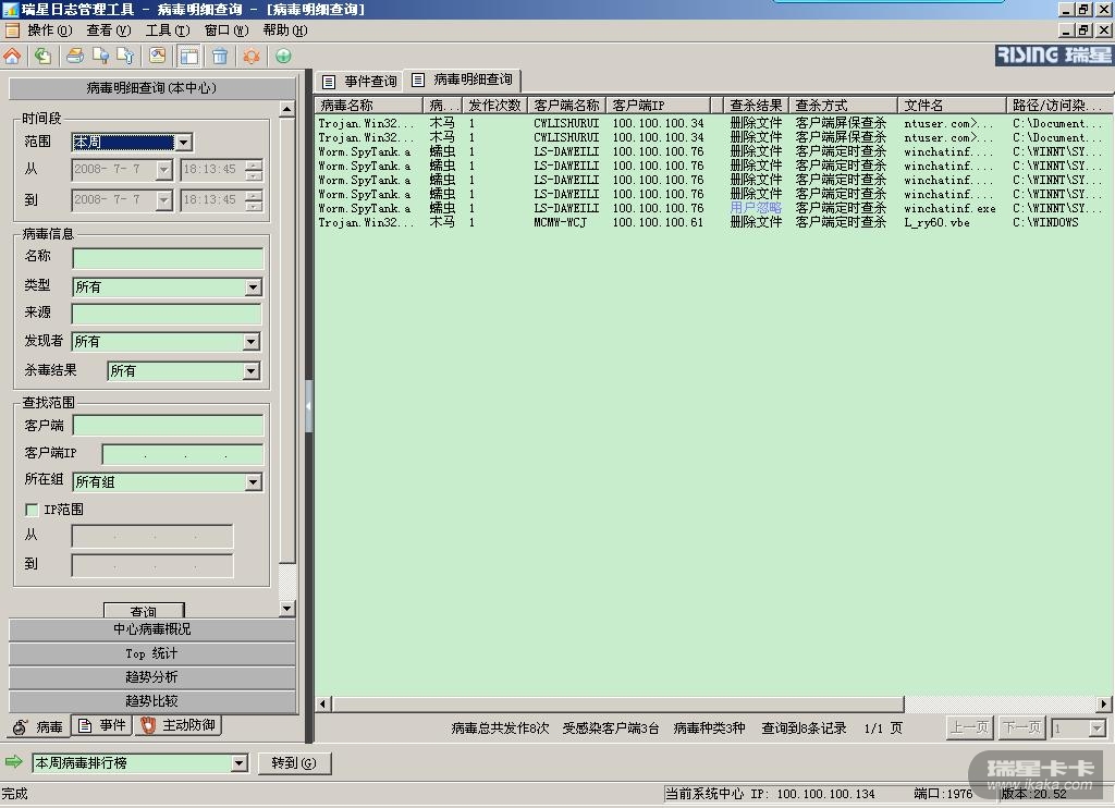Table_VirusInfo这个表是07的病毒日志,楼主查一下Table_VirusAlertStat这个表,这个表是08的病毒明细。