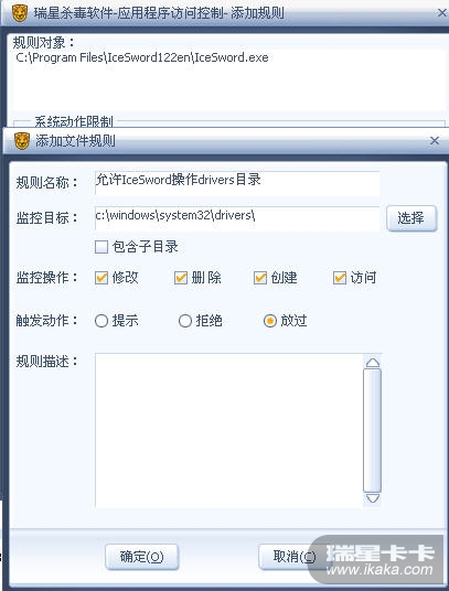 但是,这条规则妨碍IceSword使用。IceSword运行时,要在drivers目录创建驱动,加载后,再删除该驱动。因此,使用IceSword的用户可以再加一条下图所示的规则,即可解决全部问题: