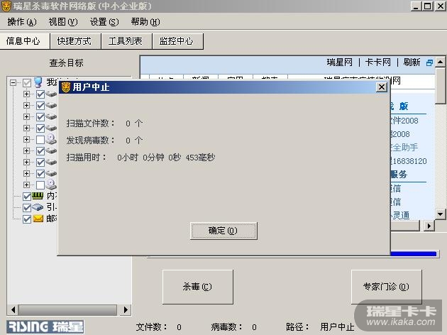 还以为是误点了“停止”了。就再点“杀毒”,结果马上弹出“用户中止对话框。
