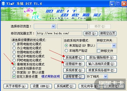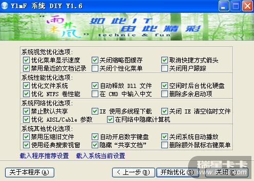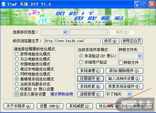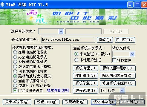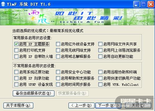 大家是否在抱怨为什么我的电脑运行这么慢,玩个游戏卡半天,在网速正常和电脑配置适当的情况下,就要考虑为自己的电脑精简些服务,通过了解,发现很多朋友连怎么关指定服务也不知道,所以这里我向大家推荐一款工具来帮你优化,不但优化你电脑的性能而且可以起到防御黑客攻击。雨林木风出品的DIY1.6 下载地址: