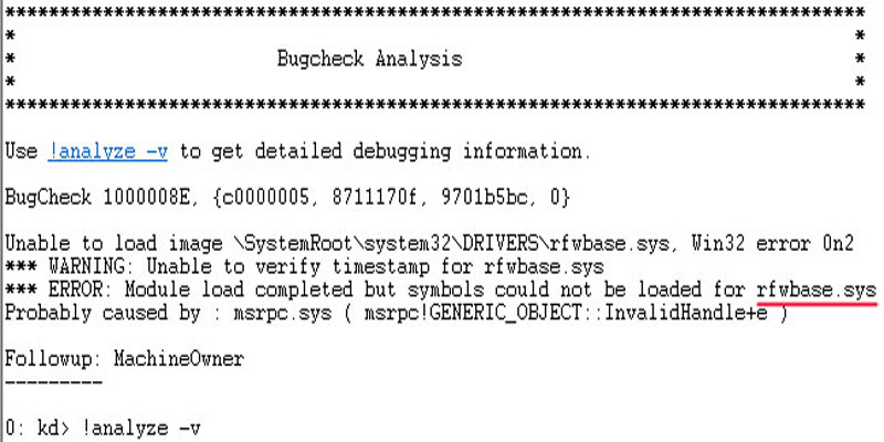 昨天电脑启动后进入桌面突然蓝屏,用Debug分析了minidump文件,发现是由于瑞星防火墙rfwbase.sys引起,瑞星防火墙近段时间怎么了?一会儿不让上网,一会又蓝屏