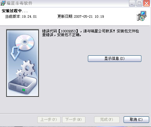 我点“是”之后出现-----错误代码10009953,请与瑞星公司联系......安装包不正确。