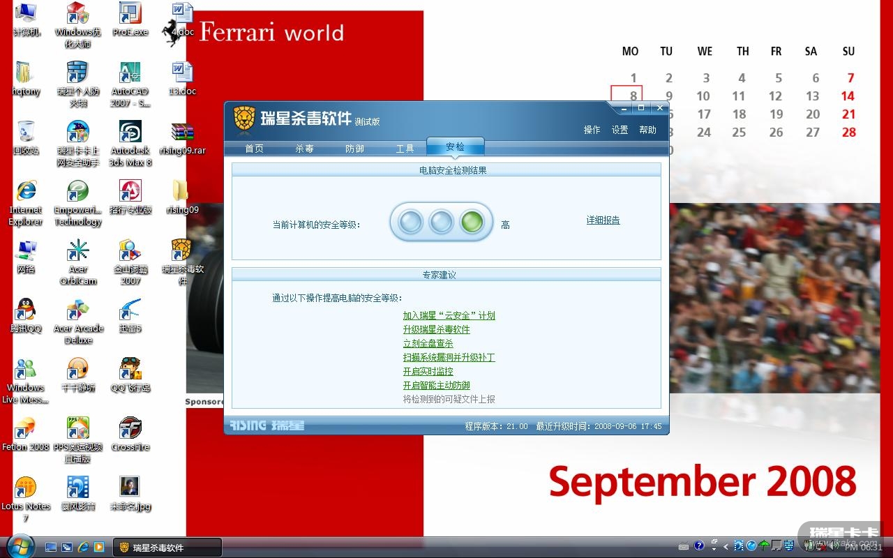 今天我装了瑞星09测试版,发现09版本绿色雨伞的图标和08版绿色雨伞的外观不一样,希望还是用08版本的样子比较好看,其次发现瑞星09版本点击设置,发现里面有好多设置,好麻烦,希望再人性化一点,08版中设置就只有三个,详细设置、监控设置、主动防御设置,这样比较清楚,希望09改进一下,其次08有账号保险柜,09测试版本中没有账号保险柜,是瑞星取消了吗?还是瑞星09版本没有做进去。其次感觉09界面很单包没有厚度感觉,希望在最大化最小化,这一行中增加渐变效果,来增加产品的厚重感。其次邮件监控没有了吗?是合并了还是怎么回事情,这个09里面有云安全计划,那卡卡助手的功能全部整合过来了吗?是不是以后09不用装卡卡6.0就像金山一样自己全部附带?