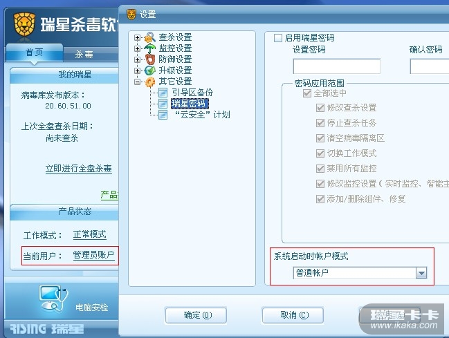 操作系统及补丁情况:Windows XP SP3 浏览器及版本:IE7 瑞星软件版本:21.00 涉及的其它软件版本: 问题现象:"系统启动时账户模式"无论如何设置,"当前用户"都只是记住上一次自身设置的值。而且当一个系统存在多用户的情况时,这个设置是所有用户共享的,我认为这不能实现有效的角色划分。
