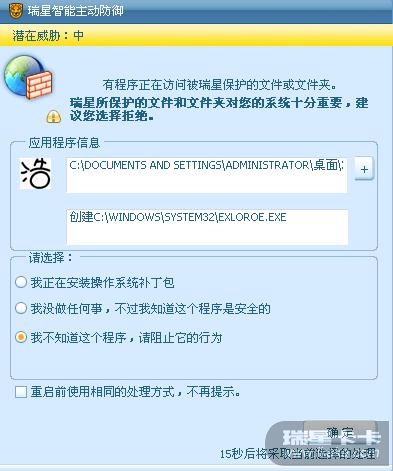 由于瑞星能查出这个病毒所以将文件监控关了,在将主动防御里系统加固能打的勾都打上了,运行病毒,随后瑞星就提示了