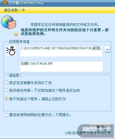 瑞星在图中所做的拦截应该影响不了小浩的感染行为,楼主确定其它的文件没有被感染?
