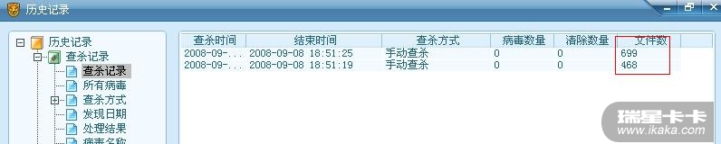 运行瑞星2009,点击“杀毒”功能项,查杀目标 状态默认,选择“开始查杀”按钮,开始一会儿,点“停止查杀”,然后选择菜单-》“历史记录”-》查杀记录里面查看,点击日志下方“清除”按钮,再次重复上述开始查杀操作,在查看日志,会发现上次清空的日志,还存在,这是问题1,问题2统计的文件数比实际扫描完毕显示的数目少1,具体如图红色区域所示,不明白的地方和我说,我再详细描述!