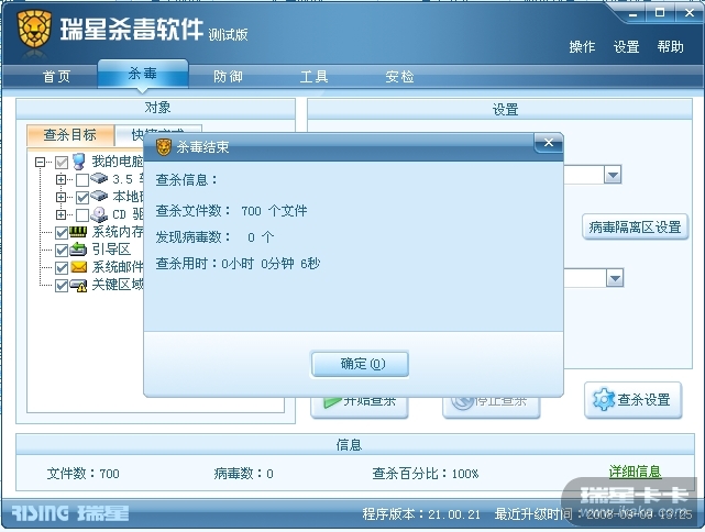 瑞星软件版本:瑞星2009 程序版本:21.00.21