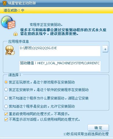 操作系统及补丁情况:windows xp sp2 浏览器及版本:IE6 瑞星软件版本:21.00.21 涉及的其它软件版本:QQ三国1.0beta3Build42 问题现象: 运行游戏,游戏加载驱动,瑞星弹出提示,选择“我正在玩游戏,是这个游戏在安装驱动”。如图: