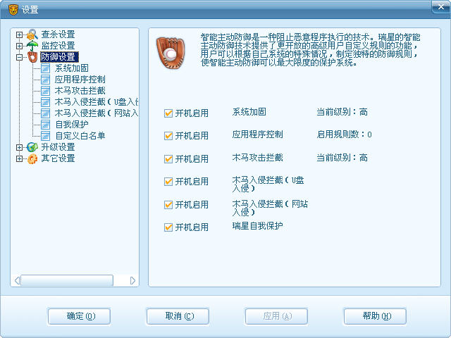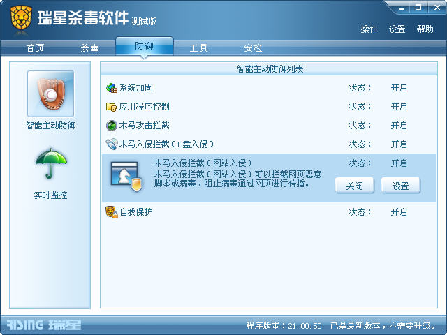 如今,“主动防御”的概念已经深入人心,看杀毒软件的优劣很大程度上要看主动防御的防护能力。看看瑞星的这个2009测试版吧。如图,主动防御确实进步了许多啊!“木马U盘入侵拦截”,对U盘病毒的拦截独立成了一个模块,应该是意料之中的设定吧,改进确实很多。“木马攻击拦截”和“木马网站入侵拦截”都是全新的概念,看来瑞星今年是有备而来喔!