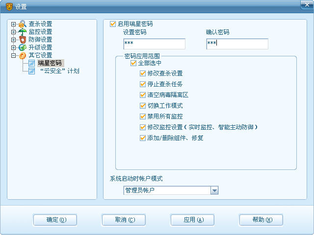 瑞星密码,很人性化的设定。可以防止别人关闭瑞星杀毒软件,让爱机暴露在不必要的“裸奔状态”下,呵呵。很适合应用的各种电脑共用的场合,比如寝室的电脑,图书馆公用上网机之类的。