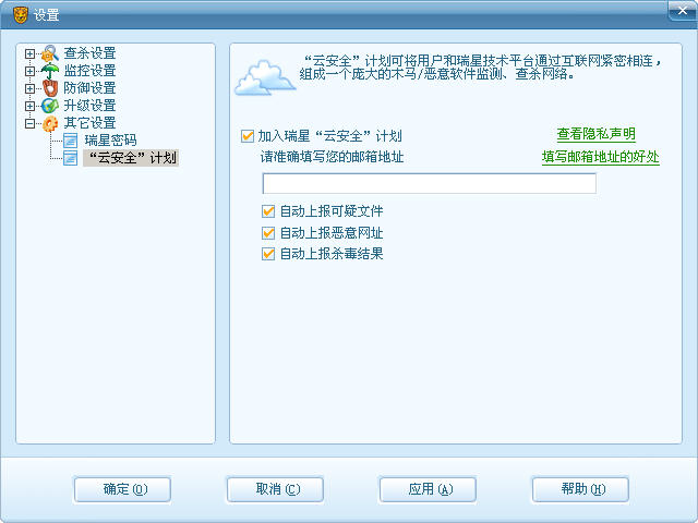 瑞星雄心勃勃的实行“云安全”计划,万众期待的这项计划终于在杀毒软件里体现了。任何人在任何时间,感染了任何未知的病毒或疑似病毒的文件、恶意网址、扫描结果,都会自动上报到瑞星的服务器。瑞星的反病毒工程师会在第一时间分析样本,然后更新病毒库,这下子他们应该会忙得不可开交吧,他们真的很敬业,呵呵。