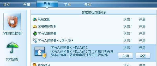 打开防御界面默认突出显示“木马入侵拦截(网页拦截)”,而不是第一个“系统加固”。