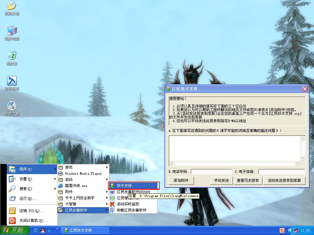 江民的此处位置有技术支持快捷方式。。。用户若使用瑞星杀毒时,发现不了病毒!而系统中确实存在未知病毒,(若卡卡无法上报),用户可以通过此窗口向工程师求助!!!