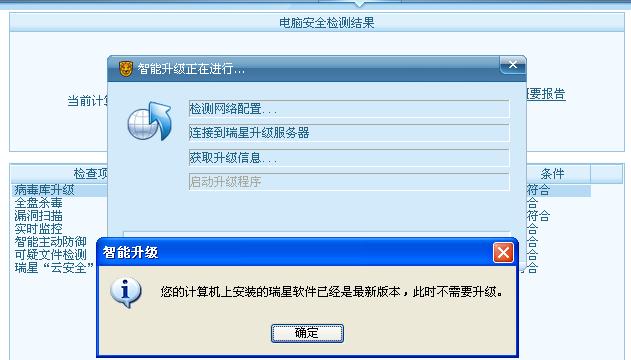 sp3浏览器及版本:explor6.0瑞星软件版本:21.00.30涉及的其它软件版本:无问题现象:病毒库最新的情况下,电脑安检显示病毒库不符合要求