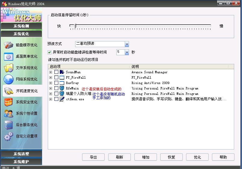 用优化大师手动添加个人防火墙随机自启动项,重启机器,进入开机画面没有防火墙的LOG,输入密码进入系统,报告一个错误提示框,系统能正常进入进入,防火墙没有随机启动。