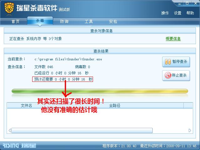 涉及的其它软件版本:必现 问题现象:瑞星2009扫描文件预计的时间很不准确,比如:有时候扫描全部硬盘时,进度条会一下子蹦到最后,可是往往会有很长时间才会扫完。而且,界面上的预计的时间不准确,有时候(如下图)扫了16秒,它显示还要16秒,实际上还有很长时间。 出现问题前的操作步骤:正常使用杀毒软件的扫描