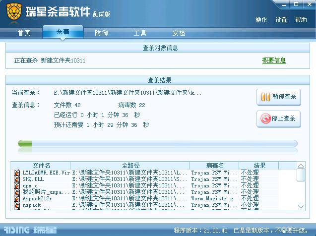 系统XPSP2,瑞星版本:21.00.40,不管是右键扫描还是什么扫描,扫描进度一直是5%不动,进度条也处于5%状态(我试过修复瑞星,重启电脑,反复测试仍然是这样)