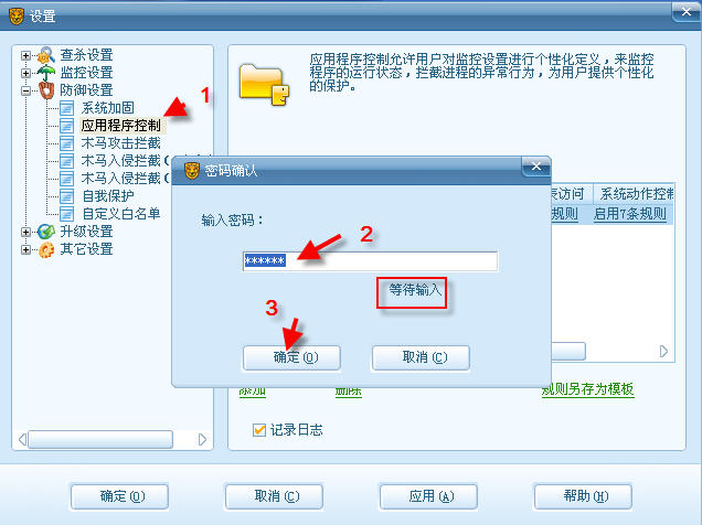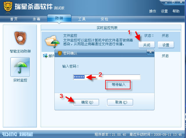 问题:密码确认。输入正确密码,点击“确定”后,瑞星无反应。一直显示“等待输入”(详见附图)