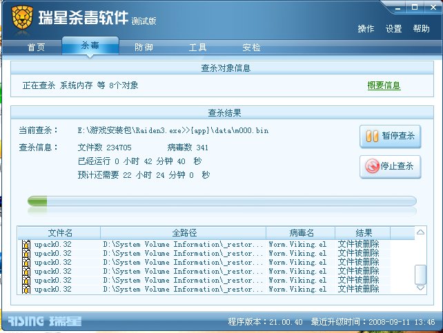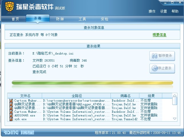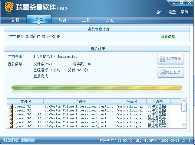 安装好测试版本进行第一次杀毒,杀出病毒346个。 在安装前已经用2008最新版本进行过全盘杀毒,并没有发现任何病毒。