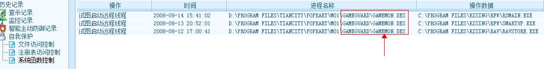 问题现象:游戏过程中突然弹出瑞星的主动防御提示(尽管已经将跑跑卡丁车和Gameguard加入白名单),干扰正常游戏出现问题前的操作步骤:开启瑞星自我保护并打开跑跑卡丁车