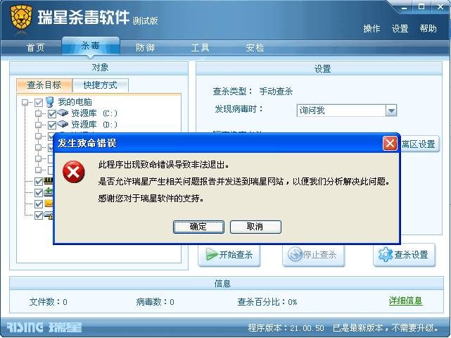 1当瑞星的进程被全部结束后,在进行扫描就会出现这个问题。