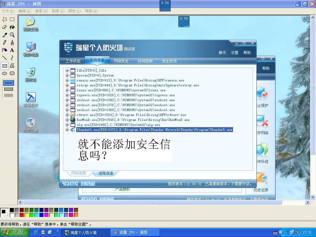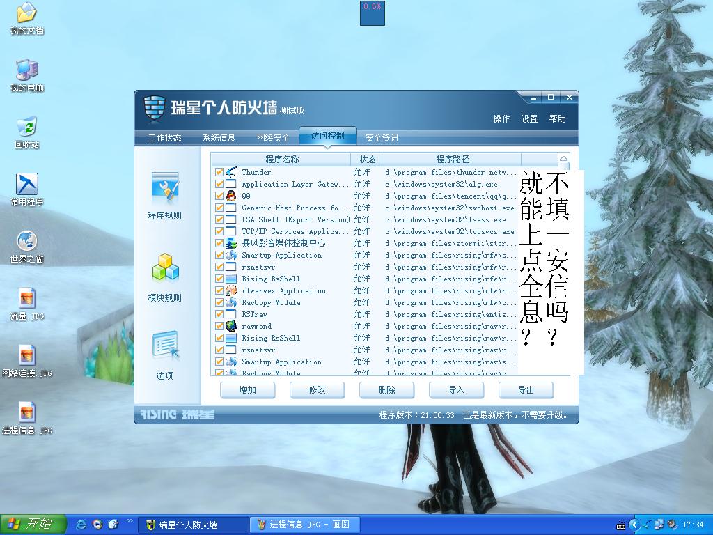 2.请在网络连接和进程信息和程序规则和模块规则中添加安全信息!!!!庞大的恶软库,若不利用起来,简直是浪费!!!!建议防火墙能像卡卡一样显示进程和模块的安全信息!!!