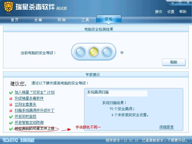 尝试点击刷新,检查显示是否正常,“可疑文件上报处字体颜色不一”,点击后查看是否有可疑文件需要上报。