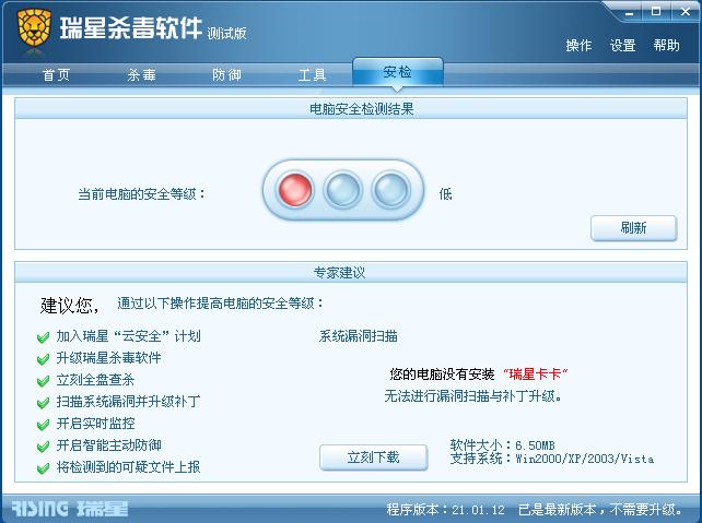 新的安检页面,不能准确检测瑞星的状态,显示的内容与实际情况不符。虽然是低安全等级,但下面的建议却都是绿钩子。另外,“建议您”三个字也太多了,颜色也应该改一下吧。