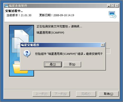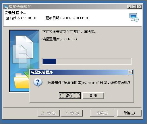 [2008-09-18][16:32:38:866][3996][1080]: [ACTION]RsMessageBox(校验组件 "瑞星通用库(RSCENTER)" 错误,继续安装吗?)...
