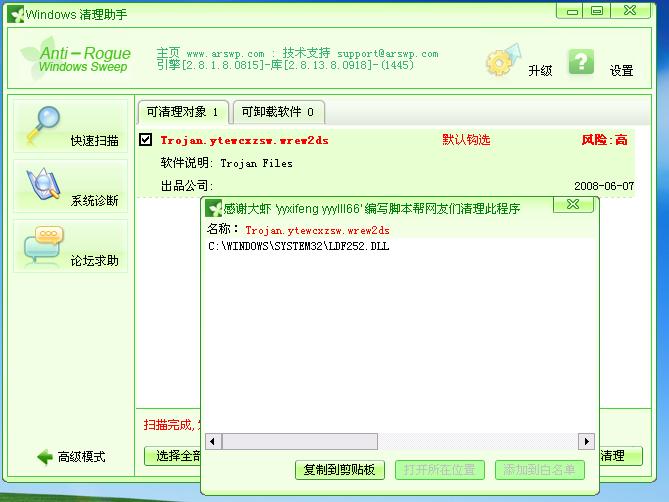 Windows清理助手,也是一很好的清理工具,据说经常发现杀毒软件不能发现的木马,也是木马必杀对象之一,我觉得其也很权威,建议瑞星公司何不去招贤,免为他人所用。