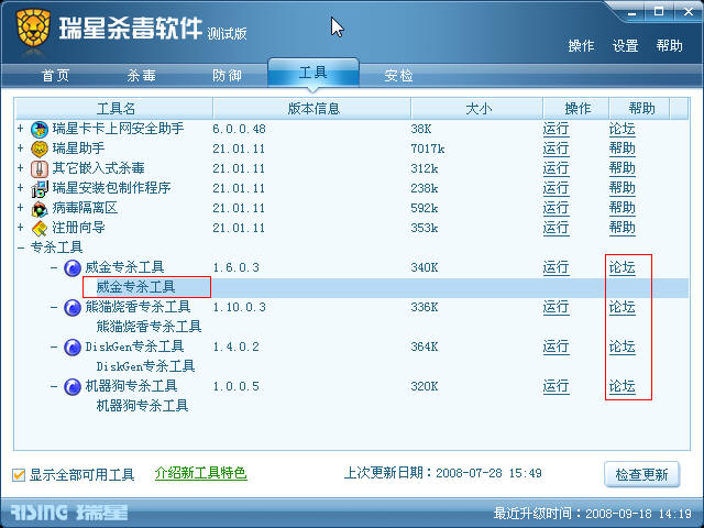 检查更新,下载了几个病毒的专杀, 专杀工具项发现可展开,可展开后,只是出现一个名称。。不知有什么用途。
