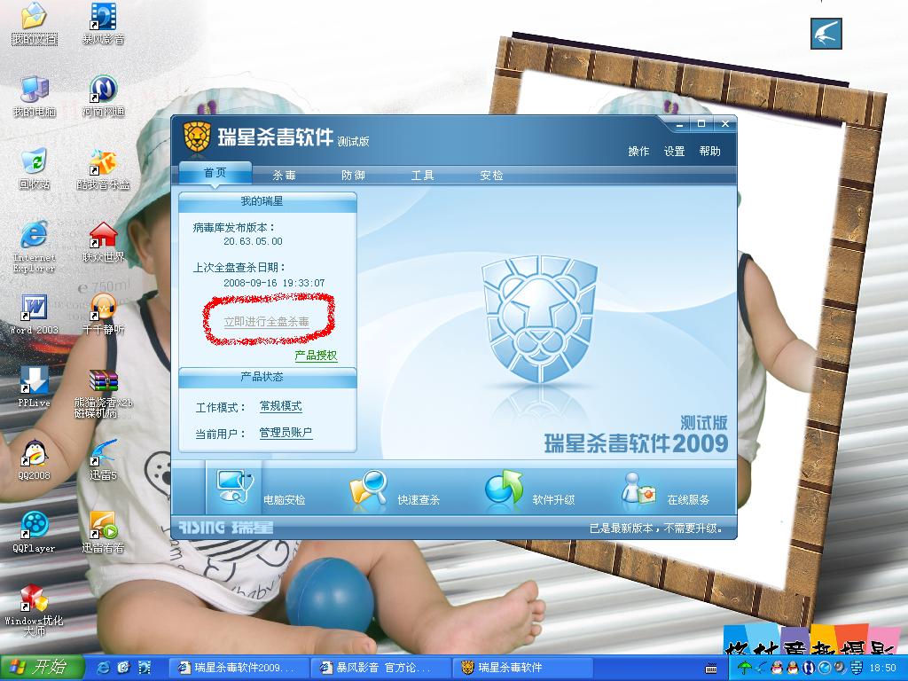 2.瑞星杀毒软件的主页上的全盘杀毒按扭呈灰色不能用!!!